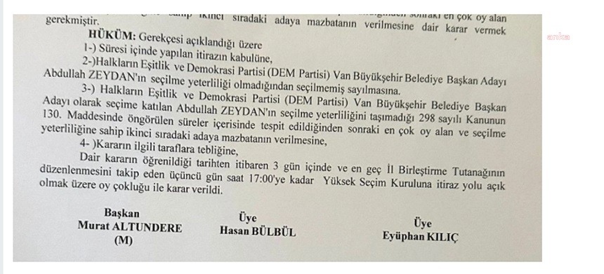 DEM Partisi Van Büyükşehir Belediye Başkan adayı Abdullah Zeydan’ın seçilme yeterliliği taşımadığı 298 sayılı kanunun 130.maddesinde öngörülen süreler içerisinde tespit edildiğinden sonraki en çok oy alan ve seçilme yeterliliğine sahip ikinci sıradaki adaya mazbatanın verilmesine,