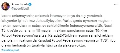 Nasıl Türkiye’de oynanan milli maçların reklam panolarının satışı Türkiye Futbol Federasyonu’na aitse, Karadağ-Türkiye maçının saha içi reklam panolarının satışını da Karadağ Futbol Federasyonu yapmıştır. TV8’in bu olayın herhangi bir tarafıyla ilgisi ya da alakası yoktur.”