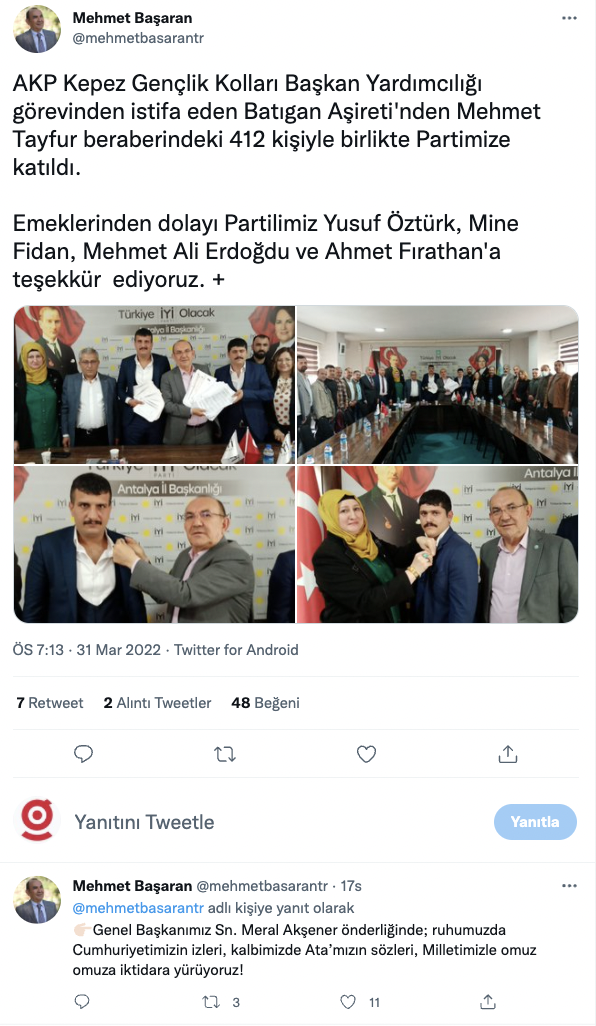 Emeklerinden dolayı partilimiz Yusuf Öztürk, Mine Fidan, Mehmet Ali Erdoğdu ve Ahmet Fırathan’a teşekkür ediyoruz. Genel Başkanımız Sn. Meral Akşener önderliğinde; ruhumuzda Cumhuriyetimizin izleri, kalbimizde Ata’mızın sözleri, Milletimizle omuz omuza iktidara yürüyoruz.”