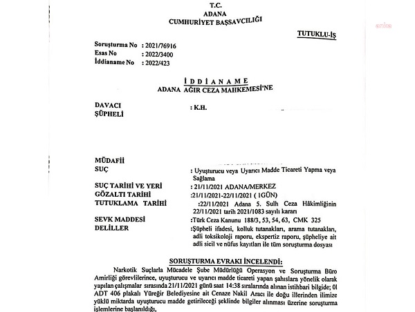 Adana Cumhuriyet Başsavcılığı, 21 Kasım 2021 tarihinde, Adana Yüreğir Belediyesi’ne ait cenaze nakil aracı ile doğu illerinden Adana’ya yüklü miktarda uyuşturucu madde getirileceği ihbarı üzerine soruşturma başlattı. Soruşturmanın tamamlanmasının ardından savcılık, iddianameyi 3 Şubat 2022 tarihinde tamamladı ve Adana Ağır Ceza Mahkemesi’ne gönderdi. İddianame kabul edildi. 2022/423 no’lu iddianameye göre; ihbarın ardından başlatılan soruşturma şöyle gelişti: