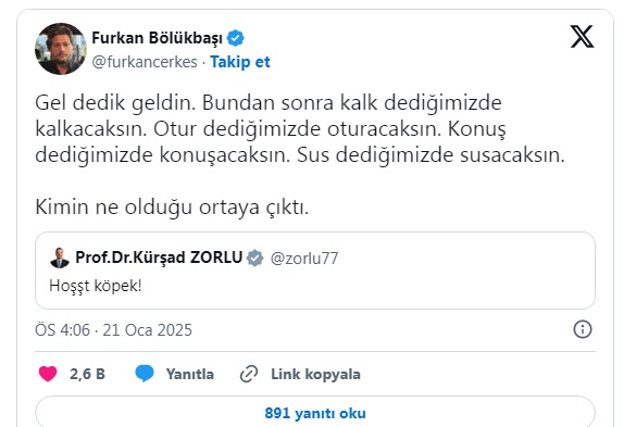 İYİ Parti Sözcülüğü görevini de yürüten Kürşat Zorlu AKP’ye geçti. AKP trolü Furkan Bölükbaşı, Zorlu’ya “Kalk dediğimizde kalkacaksın. Otur dediğimizde oturacaksın” ifadelerini kullandı.