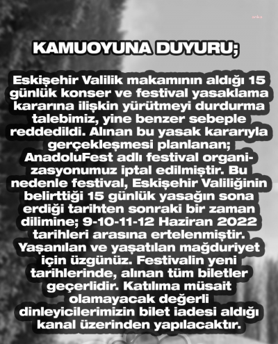 “Eskişehir Valilik makamının aldığı 15 günlük konser ve festival yasaklama kararına ilişkin yürütmeyi durdurma talebimiz, yine benzer sebeple reddedildi. Alınan bu yasak kararıyla gerçekleşmesi planlanan AnadoluFest adlı festival organizasyonumuz iptal edilmiştir. Bu nedenle festival, Eskişehir Valiliği’nin belirttiği 15 günlük yasağın sona erdiği tarihten sonraki bir zaman dilimine, 9-10-11-12 Haziran 2022 tarihleri arasına ertelenmiştir.