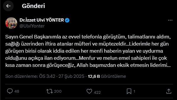 Açıklamasında, “Sayın Genel Başkanımızla az önce telefonda görüştüm, kendisinden talimatlarını aldım. Sağlığıyla ilgili ortaya atılan iddialar tamamen yalan ve iftiradır. Liderimle her gün görüşen biri olarak bu tür asılsız haberlerin uydurma olduğunu net bir şekilde ifade ediyorum. Bu yalanları yayanlarla en kısa zamanda hesaplaşacağız. Allah liderimizi başımızdan eksik etmesin” ifadelerine yer verdi.