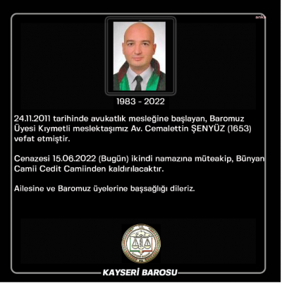 Kayseri Barosu, Cemalettin Şenyüz için bir taziye mesajı yayınladı. Mesajda, “24.11.2011 tarihinde avukatlık mesleğine başlayan, Baromuz üyesi kıymetli meslektaşımız Av. Cemalettin Şenyüz vefat etmiştir. Meslektaşımıza Allah’tan Rahmet, ailesine ve Baromuz üyelerine başsağlığı dileriz” denildi.