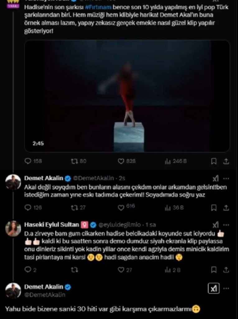 Bir sosyal medya kullanıcısı “Hadise’nin şarkısı Fırtınam bence son 10 yılda yapılmış en iyi pop şarkılardan biri. Hem müziği hem klibiyle harika. Demet Akal’ın buna örnek alması lazım, yapay zekasız gerçek emekle nasıl güzel klip yapılır gösteriyor!” diye yazdı.