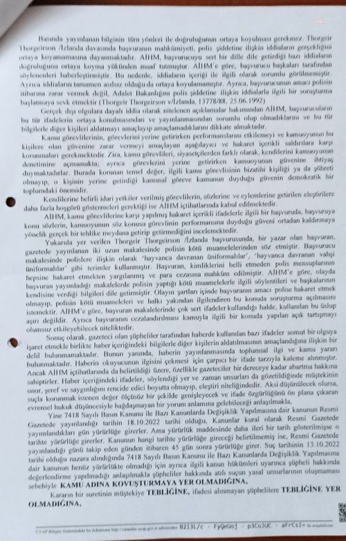 “Yine 7418 Sayılı Basın Kanunu ile Bazı Kanunlarda Değişiklik Yapılmasına dair kanunun Resmi Gazetede yayınlandığı tarihin 18.10.2022 tarihi olduğu… Kanunlar kural olarak Resmî Gazetede yayımlandıkları gün yürürlüğe girerler. Ama yürürlük maddesinde daha ileri bir tarih gösterilmişse o tarihte yürürlüğe girerler. Kanunun hangi tarihte yürürlüğe gireceği belirtilmemiş ise Resmî Gazete’de yayınlandığı günü takip eden günden itibaren 45 gün sonra yürürlüğe girer. Suç tarihinin 13.10.2022 tarihi olduğu nazara alındığında 7418 Sayılı Basın Kanunu ile Bazı Kanunlarda Değişiklik Yapılmasına Dair Kanun henüz yürürlükte olmadığı için ayrıca ilgili kanun hükümleri uyarınca şüpheli hakkında değerlendirme yapılmadığı anlaşılmakla şüpheliler hakkında atılı suçun yasal unsurlarının oluşmaması sebebiyle kamu adına kovuşturmaya yer olmadığına karar verildi.”