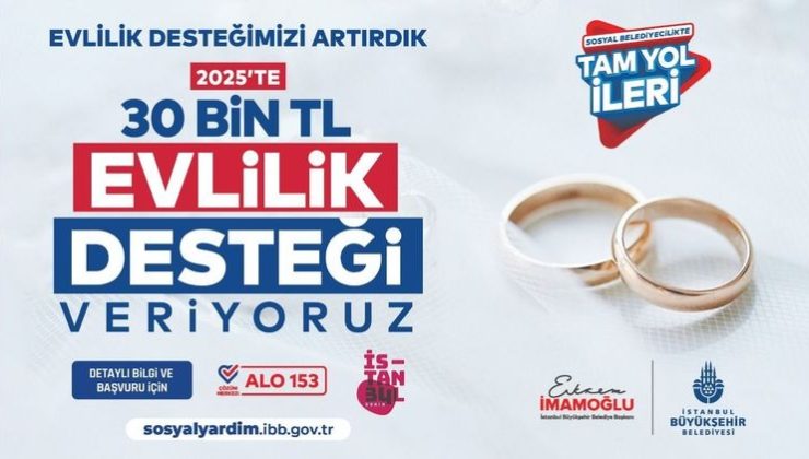 İstanbul Büyükşehir Belediyesi (İBB), “Evlilik Desteği” ile İstanbul’da ihtiyaç durumu tespit edilen çiftlere ekonomik destekte bulunarak zorlu süreçlerinde yanlarında olmaya devam ediyor. Ekonomik krizin getirisi enflasyon, artan yoksulluk gibi nedenleri göz önünde bulundurularak yeni evlenen çiftlere verilen maddi destek artırıldı. 15 bin TL olan “Evlilik Desteği”, 30 bin TL’ye çıkarıldı.
