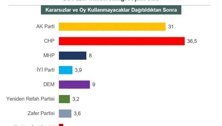 19-22 Mayıs tarihleri arasında 2 bin 4 kişiyle CATI yöntemiyle (Bilgisayar Destekli Telefonda Anket) yapılan ankette CHP’nin yüzde 30,8 AKP’nin ise yüzde 26,1 puan aldığı görüldü. Kararsızlar dağıldıktan sonra yapılan sonuçta ise CHP’nin yüzde 36,5 AKP’nin ise yüzde 31 aldığı görüldü.