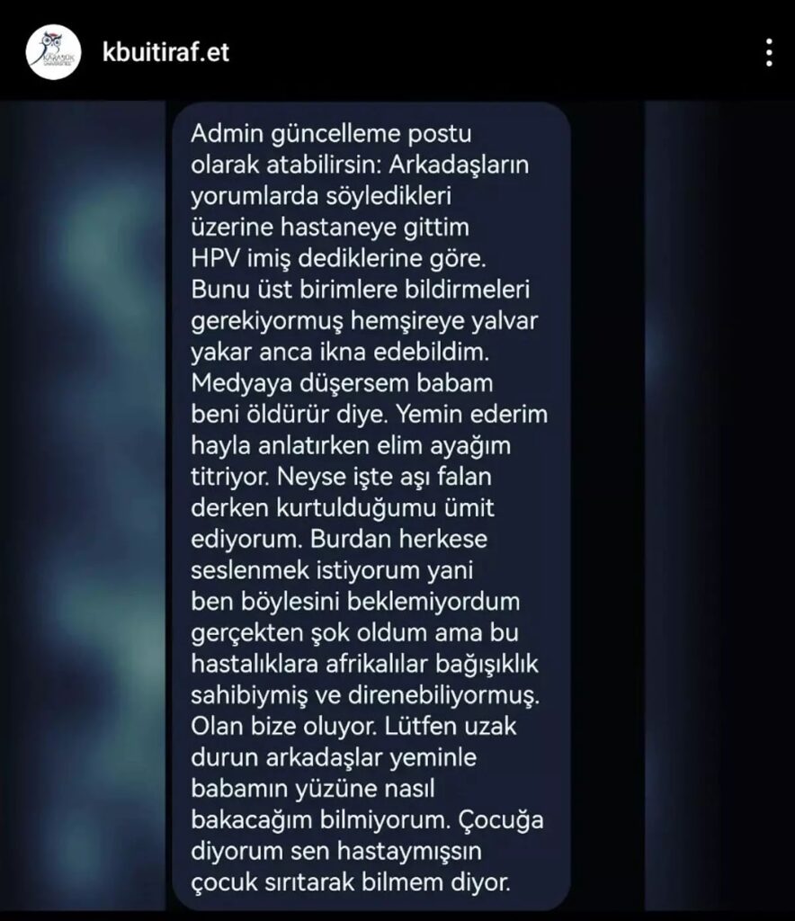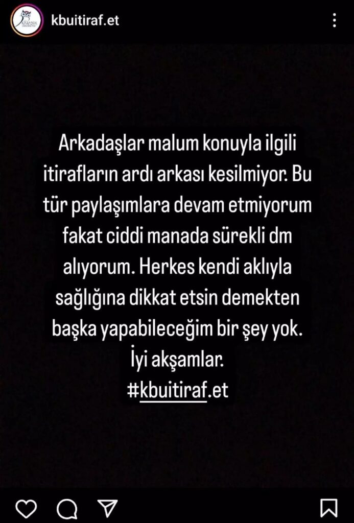 Bu gündem olan itirafların ardından da sayfa yöneticisi “Malum konuyla ilgili itirafların ardı arkası kesilmiyor. Bu tür paylaşımlara devam edemiyorum fakat ciddi anlamda sürekli mesaj alıyorum. Herkes kendi aklıyla sağlığına dikkat etsin demekten başka yapabileceğin bir şey yok.” açıklaması yaptı.