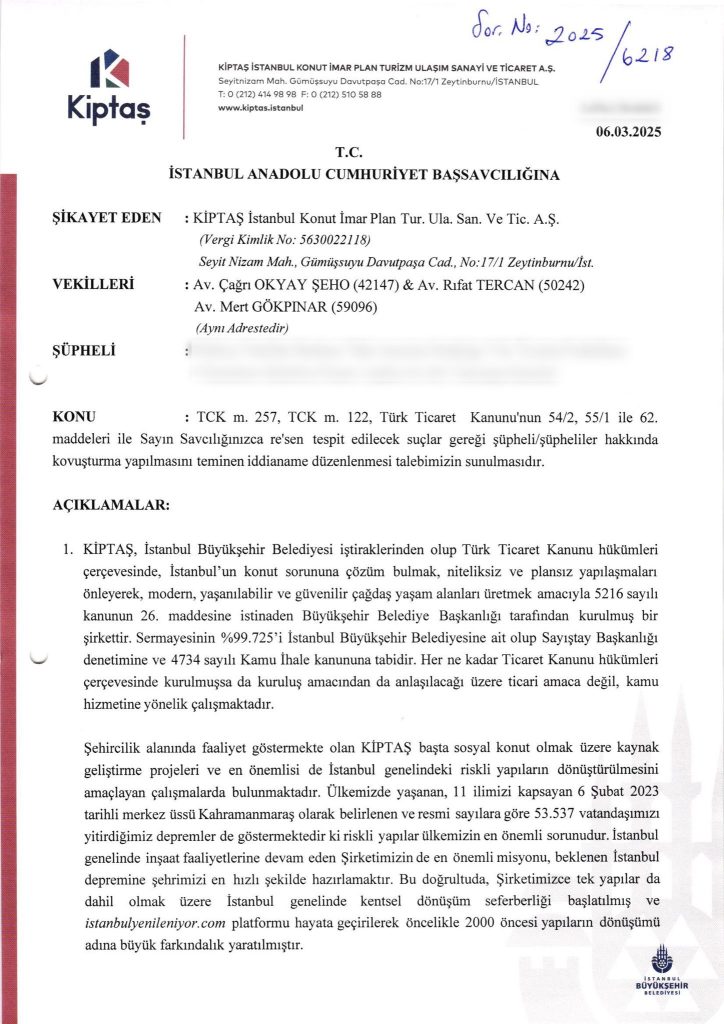 İstanbul Büyükşehir Belediyesi (İBB) İştirakler Şehircilik Grubu şirketi KİPTAŞ, kamu bankalarının riskli yapılarını dönüştürmek isteyen vatandaşlara konut kredisi kullandırmaması nedeniyle kamu bankalarının yöneticileri hakkında savcılığa suç duyurusunda bulundu.