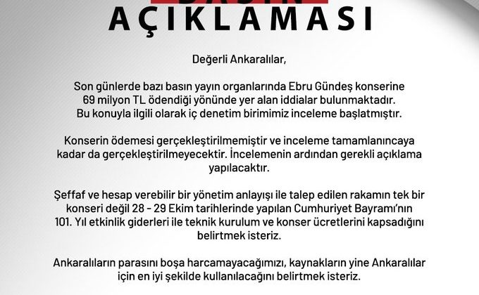 Ankara Büyükşehir Belediye Başkanı Mansur Yavaş, Cumhuriyet Bayramı’nın 101. yıl kutlamaları kapsamında Ebru Gündeş konserine 69 milyon TL ödendiği yönündeki iddialara ilişkin bir açıklama yaptı. Yavaş, yazılı açıklamasında bu iddiaların bazı basın-yayın organlarında yer aldığını belirterek konuyla ilgili iç denetim biriminin inceleme başlattığını duyurdu.