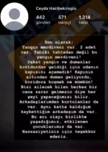 “Son olarak; Yangın merdiveni var. 2 adet var. Tabi ki tahtadan değil bu yangın merdiveni! Fakat yangın ve dumanlar koridordan geldiği için odanın kapısını açamadık! Kapının altından duman geliyordu, koridora koşmak ne mümkün! Bizi ailecek bilen herkes bir cana zarar gelmesin diye her şeyi yapacağımızı bilir. Arkadaşlarımdan kurtulanlar da var. Aynı katta kaldığım kaybettiğim arkadaşım da var. Bu acı olayı birlikte yaşadığımız, etkilenen çocuklarımız da var. Hassasiyetiniz için teşekkür ederiz. Başımız sağ olsun.”