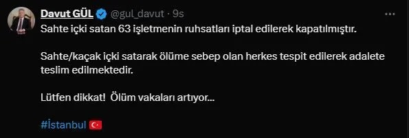 Vali Davut Gül, sosyal medya hesabından yaptığı açıklamada, “Sahte içki satan 63 işletmenin ruhsatları iptal edilerek kapatılmıştır. Sahte ve kaçak içki satarak ölüme sebep olan herkes tespit edilerek adalete teslim edilmektedir. Lütfen dikkat! Ölüm vakaları artıyor” ifadelerine yer verdi.