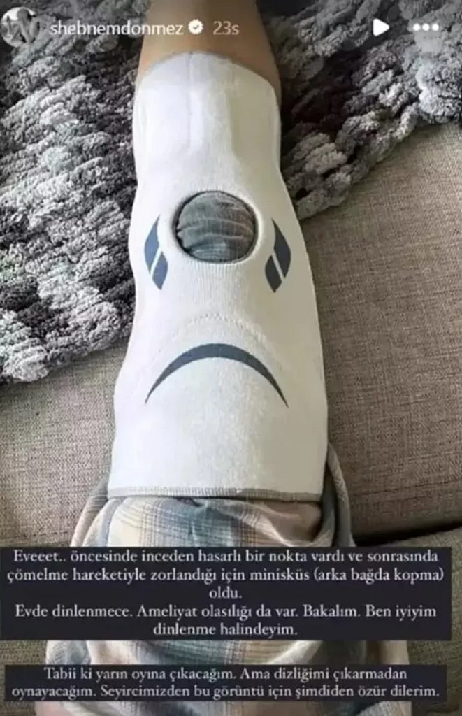 Sacit Aslan Haberine Göre; Sosyal medya hesabından sargıda olan dizini paylaşan Şebnem Dönmez “Öncesinde inceden hasarlı bir nokta vardı, sonrasında ise öne eğilme hareketiyle zorlanınca menisküsümde (arka bağda kopma) bir sorun oluştu. Evde dinleniyorum, ameliyat olma olasılığı da var, bakalım. Ben iyiyim, dinleniyorum” ifadelerini kullandı.