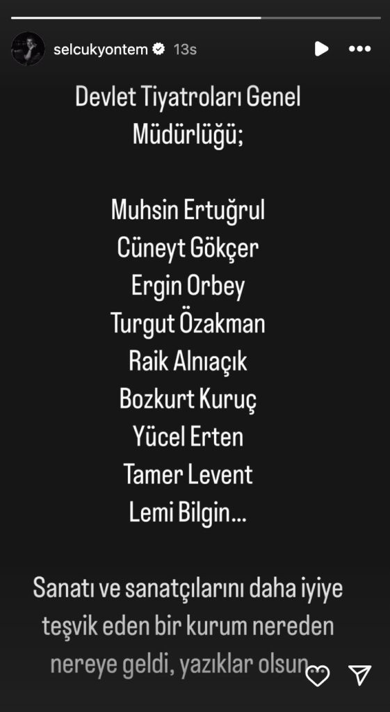 Tiyatro ve televizyon dünyasının usta isimlerinden Selçuk Yöntem, yaşanan olayla ilgili sosyal medyada yaptığı sert paylaşımla gündeme geldi. Yöntem, paylaşımında şu ifadeleri kullandı: “Sanatı ve sanatçılarını daha iyiye teşvik eden bir kurum nereden nereye geldi. Yazıklar olsun.” Bu sözler, olayın sanat dünyasında büyük bir rahatsızlık yarattığını gözler önüne seriyor.