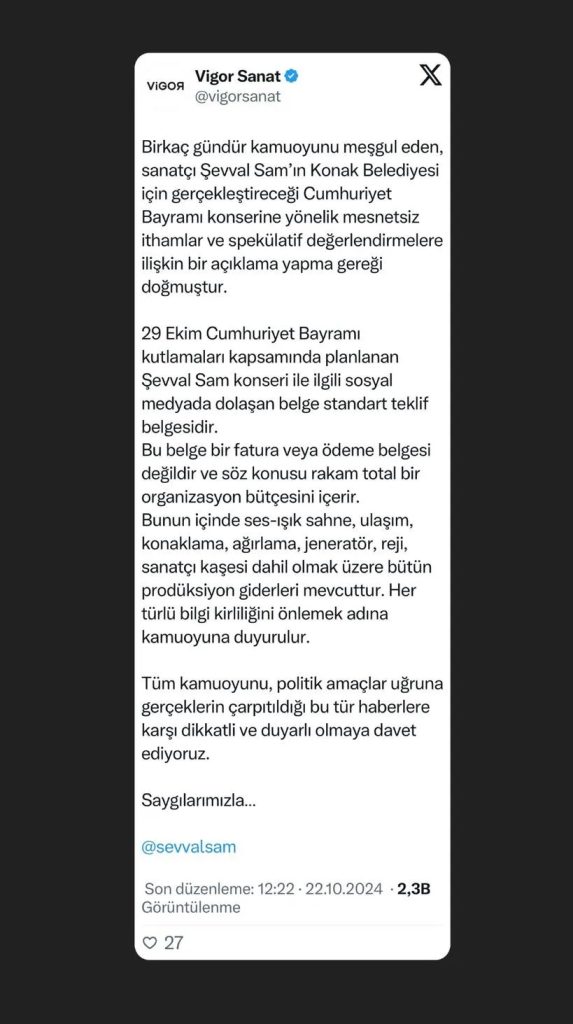 “Birkaç gündür kamuoyunu meşgul eden, sanatçı Şevval Sam’ın Konak Belediyesi için gerçekleştireceği Cumhuriyet Bayramı konserine yönelik mesnetsiz ithamlar ve spekülatif değerlendirmelere ilişkin bir açıklama yapma gereği doğmuştur.