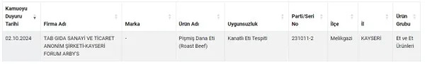 Yapılan incelemelerde 231011-2 parti numaralı Roast Beef ürününde kanatlı etinin tespit edildiği belirtildi.